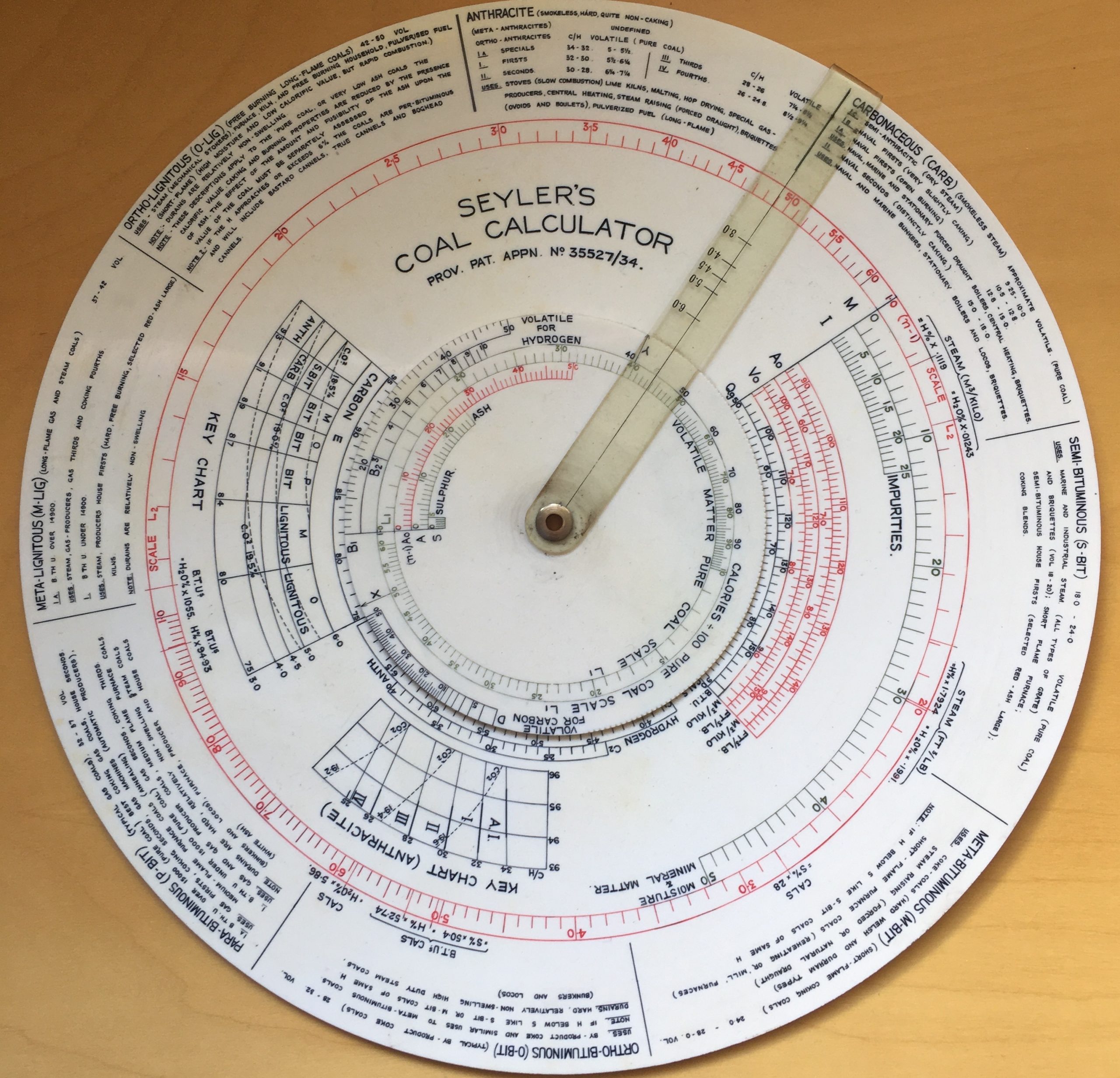 The importance of coal in the vast metallurgical industries of south Wales led Seyler to take up problems in classifying coals. He researched the chemical basis of the amount of heat released in the combustion of a unit amount of coal, i.e., its calorific value. Starting in 1899, with pioneering papers on the chemical composition of coals presented to the South Wales Institute of Engineers, he developed an internationally accepted system for the classification of coal based on the composition carbon and hydrogen, Seyler (1899, 1900, 1931, 1938, 1948). The system was captured and refined in the creation of the famous Seyler Coal Chart that offered access to data about volatile matter and calorific values of coals, and which was also published in the Institute’s Proceedings. The chart is accompanied by elegant equations for hydrogen and carbon, which are the basis of a circular calculator designed to aid engineers evaluations of coals and their suitablilty (Seyler 1948).